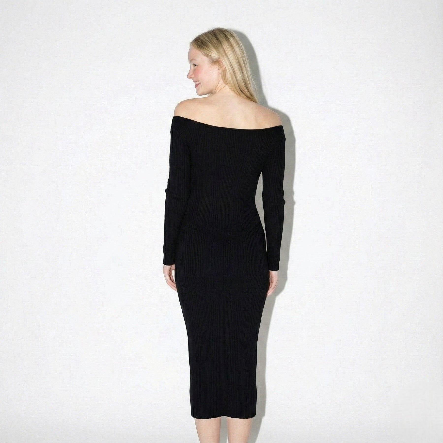 The wide off-shoulder neckline and ribbed fabric hug the body from shoulder to hem, giving this dress a sleek, confident shape that needs nothing added to it. The long sleeves keep it covered while the fitted silhouette does the rest. Simple in construction, striking in effect.